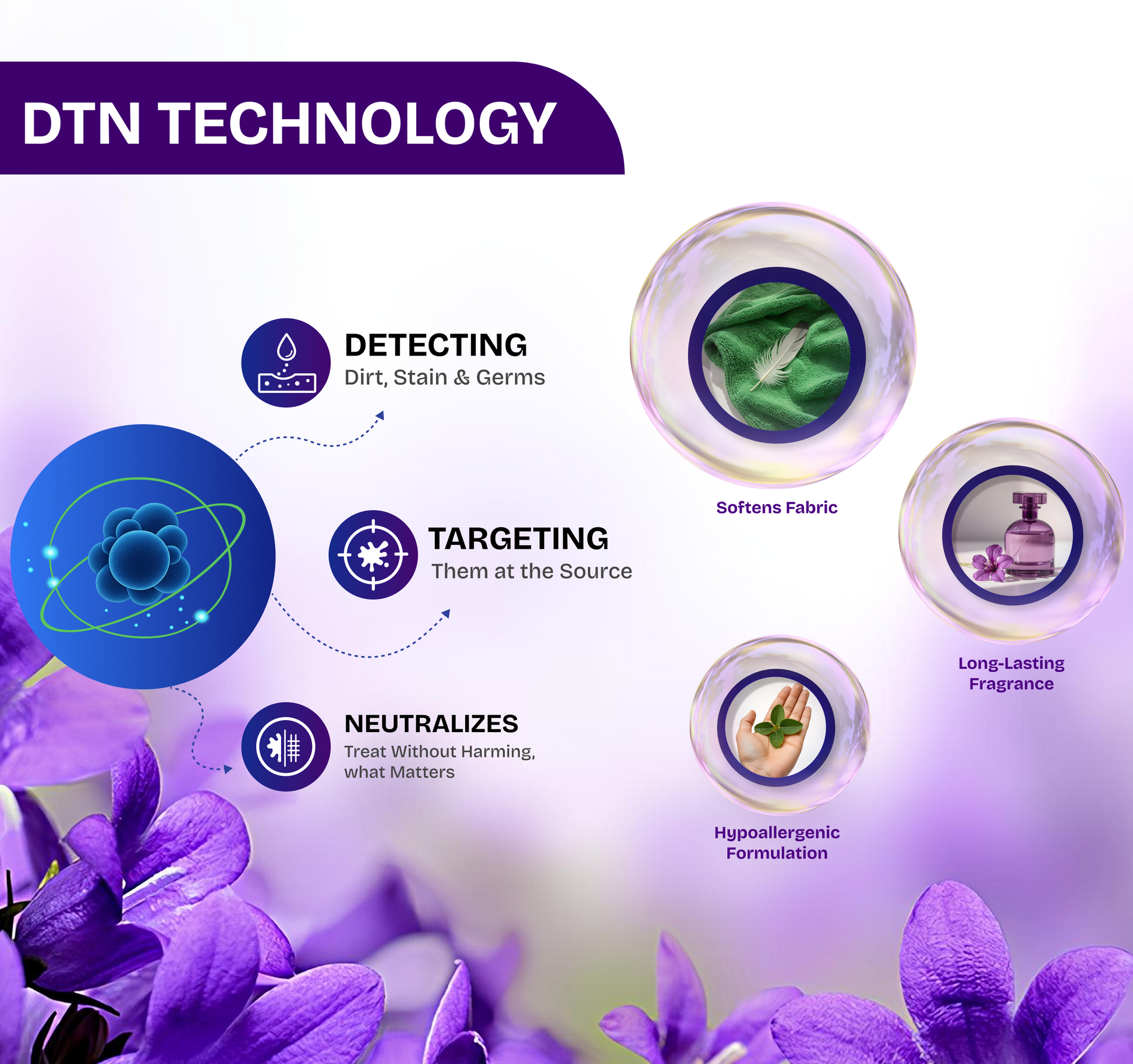 • AI + DTN Technology: Intelligent formula powered by AI precision & DTN tech to detect, target & neutralize residues for cleaner, fresher fabrics.